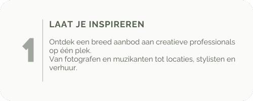 Vind een ruim aanbod aan fotografen. Elk met hun eigen stijl, verhaal en oog voor detail. Van huwelijksfotografen en familieshoots tot branding-, lifestyle- en portretfotografie.